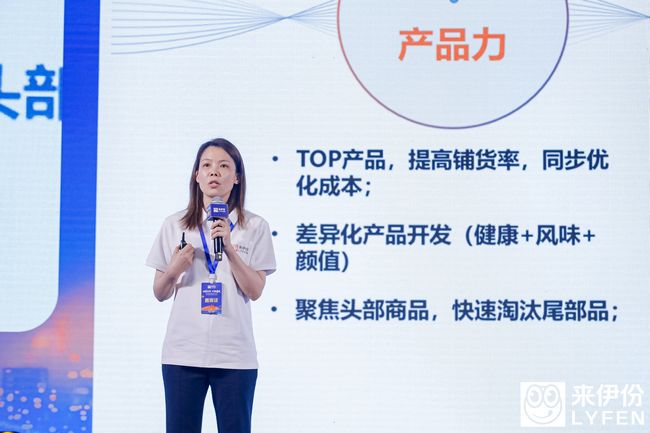 ▲來伊份品牌營銷中心CGO姜振多進行主題演講以提升單店業(yè)績增長為核心,來伊份圍繞不同的用戶群制定專屬的營銷與產(chǎn)品策略。升級門店軟裝、產(chǎn)品形象包裝,從傳統(tǒng)營銷向數(shù)字化營銷轉型,將營銷熱點與門店緊密聯(lián)動,實現(xiàn)全生命周期的運營,尋求“破圈”之道。將聲量、流量轉化成銷量,不遺余力地為合作伙伴賦能。“從聲量、流量到銷量,我們會更好地把來伊份的大旗插遍全國的大江南北。”姜振多不僅說出了來伊份品牌營銷的決心,也喊出了所有合作伙伴共同的心聲。截至目前,來伊份已累計服務用戶8.6億人次,全網(wǎng)擁有8900萬用戶,私域用戶數(shù)達4500多萬,龐大的用戶集群是來伊份核心的品牌資產(chǎn),把美好的愿景與價值觀傳遞給消費者,則是來伊份始終堅持努力在做的。以產(chǎn)品為抓手,加強供應鏈質(zhì)價比門店的核心是業(yè)績,而實現(xiàn)業(yè)績的核心,則是對產(chǎn)品的抓手。針對產(chǎn)品,來伊份集團副總裁兼供應鏈管理總裁張麗華表示“來伊份供應鏈做的不僅僅是追求數(shù)量,更關注質(zhì)量,以用戶為導向開發(fā)市場能接受的新品,是我們正在進行變革以及通過系統(tǒng)化實現(xiàn)的方向。”
